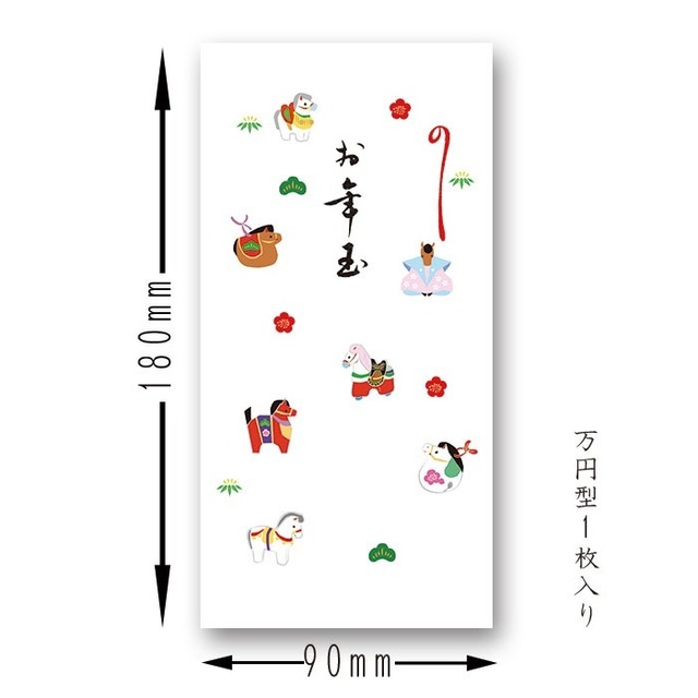 令和8年(2026年)午(うま)年のお年玉用祝儀袋です。 紙は和紙を使用しており、お札を折らずに入れて頂く、万円型サイズのポチ袋です。 干支十二支のうち午の柄が1枚入った商品です。 祝儀袋の表書きには、「お年玉」と印字されていますので、その下にお名前や裏に金額などを書いていただくだけでお使いいただけますのでとても便利です。 メール便対応商品です。 取り扱い状況によっては、お荷物の到着が4日以上かかることもございます。予めご了承願います。 日数に余裕のない場合は、宅配便をご選択ください。 メール便を複数に分けて送られる場合は、同時に届かず、日をまたぐこともございます。 配達時の事故・盗難・紛失などは補償対象外となりますので当店での責任は負いかねますことをご了承ください。 同梱する商品などにより異なりますが、目安として10個前後くらいまで同梱可能です。 注文確認画面で配送方法を設定してください。 メール便の対応サイズは、 ・長辺340mm X 248mm(A4サイズファイル) ・厚さ3cm以内 ・重量1kg以下 となっております。 規格を超えて御注文をされた場合は、送料変更等のご連絡を差し上げます。 長期不在等でお受け取り頂けない場合又は住所変更等で当店に商品が返送された際にも、お代金は頂戴致します。 再送の場合は再送料を頂きます。 また、発送後の住所変更、部屋番号記入漏れ、住所間違いに関しましても、 再送料はお客様負担となりますので、お間違いがないか確認の上ご購入ください。 サイズ 縦: 180mm 横: 90mm(お札をそのまま折らずに入れて頂くサイズ 万円型)