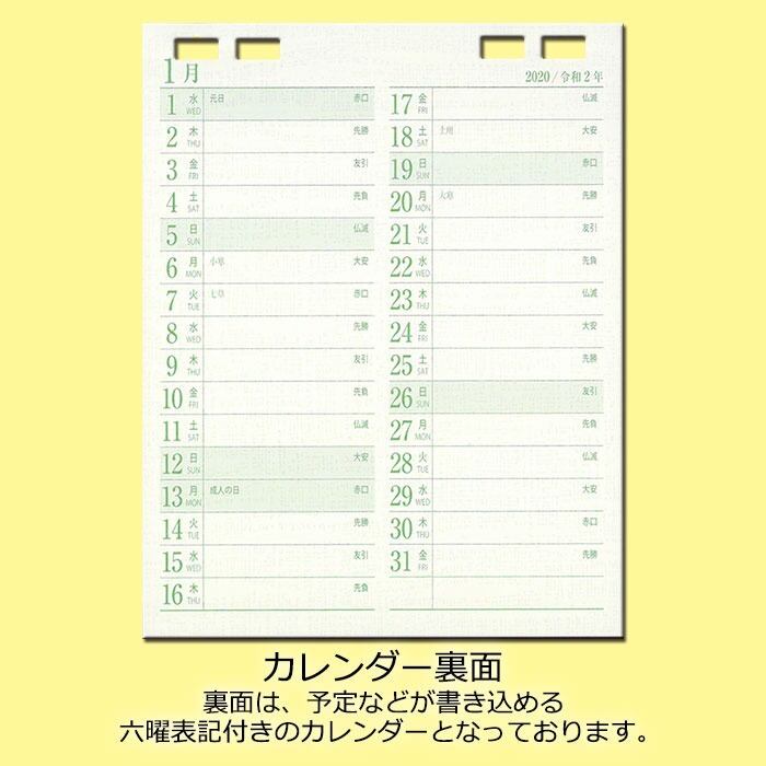 各月のカレンダーの裏面には大安などの六曜が記載されており、予定・スケジュールも書き込んで頂く事ができます。
