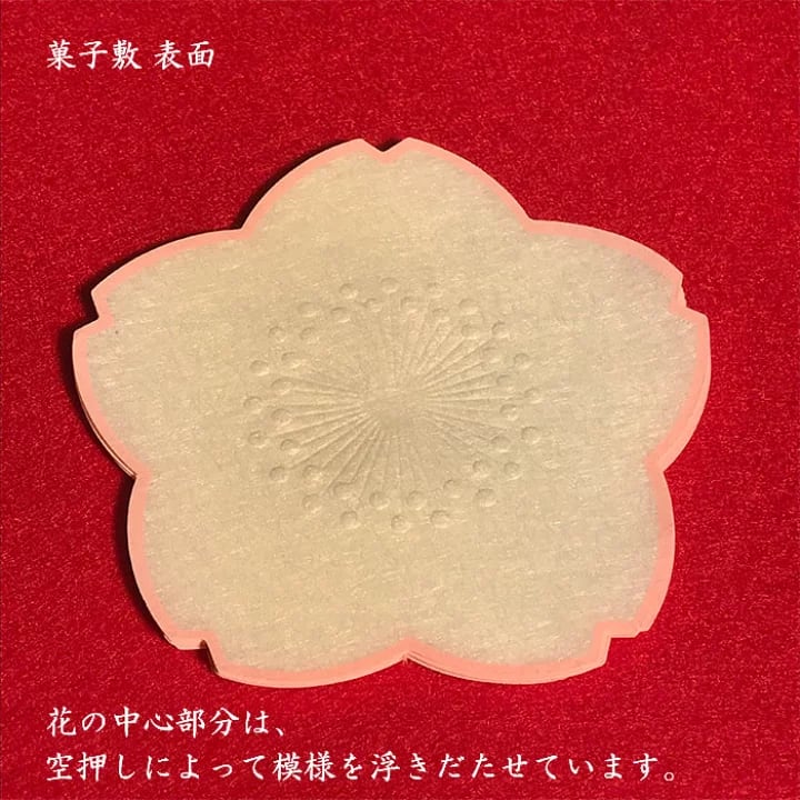 今回の商品は春の季節の花を代表する桜(さくら)の花を活版印刷によりピンク色を丁寧に刷り重ねた流麗優美な和紙による菓子敷です。